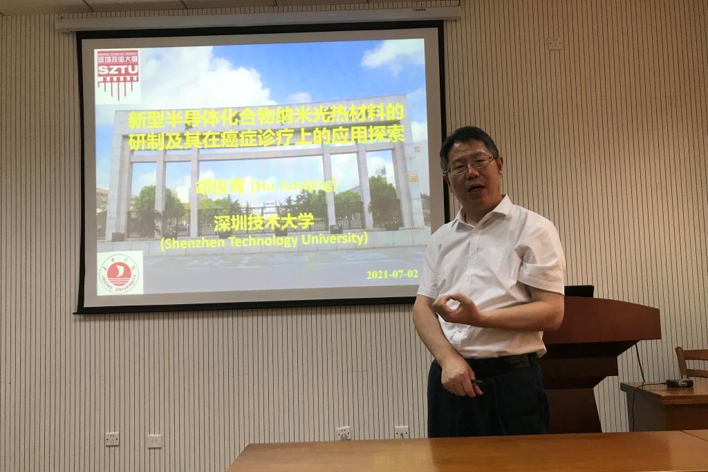 7月2日上午,应时时彩 邀请,深圳技术大学健康与环境工程时时彩 院长胡俊青一行来访,并作题为“新型半导体化合物纳米光热材料的研制及其在癌症诊疗上的应用探索”的学术报告,时时彩 刘小明教授主持讲座,全院师生30余人到场聆听。