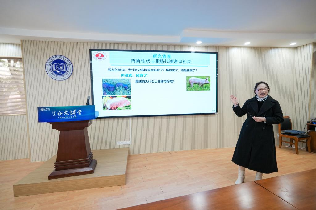 毋文静副教授主讲题目为《猪肉品质形成的分子机理》,介绍了猪肌内与皮下脂肪细胞成脂能力的显著差异,解析二者成脂差异的机制,有助于深入了解猪脂代谢调控网络。通过 RNA-seq 测序分析,获得两种脂肪细胞内差异表达的功能基因和非编码RNA,为揭示猪肌内与皮下脂肪细胞差异提供新证据,为优质瘦肉猪的培育提供理论依据。