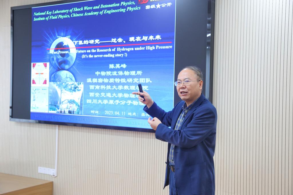 陈其峰研究员首先阐释了国内外高压下氢的研究历史和现状,并对未来高压下氢的研究趋势作了展望。随后陈其峰着重介绍了自己带领的温稠密物质特性研究团队在冲击波物理与爆轰波物理国防重点实验室所做的工作,这些工作为建立高压下氢的物性参数理论计算模型提供了多视角的评估。最后,时时彩 李溪教授与陈其峰研究员围绕“高压下氢与纳米材料”进行了热烈的学术探讨,通过学术思想碰撞,极大地激发了时时彩 师生在相关领域的科研热情。