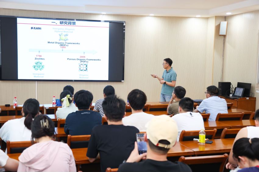 江令昌博士作题为《构筑特异功能多孔材料强化目标分子选择性捕获》的报告。报告提出,工业上气体分子捕获与分离过程耗能巨大,而筛选高效的固体吸附剂选择性捕获目标分子至关重要。基于此,报告人开展了利用功能高比面积有机多孔材料分离纯化乙烯与选择性捕获二氧化碳等方面的研究通过系统研究材料结构与性能之间的关系,为设计高性能的吸附剂选择性捕获目标分子提供重要参考。
