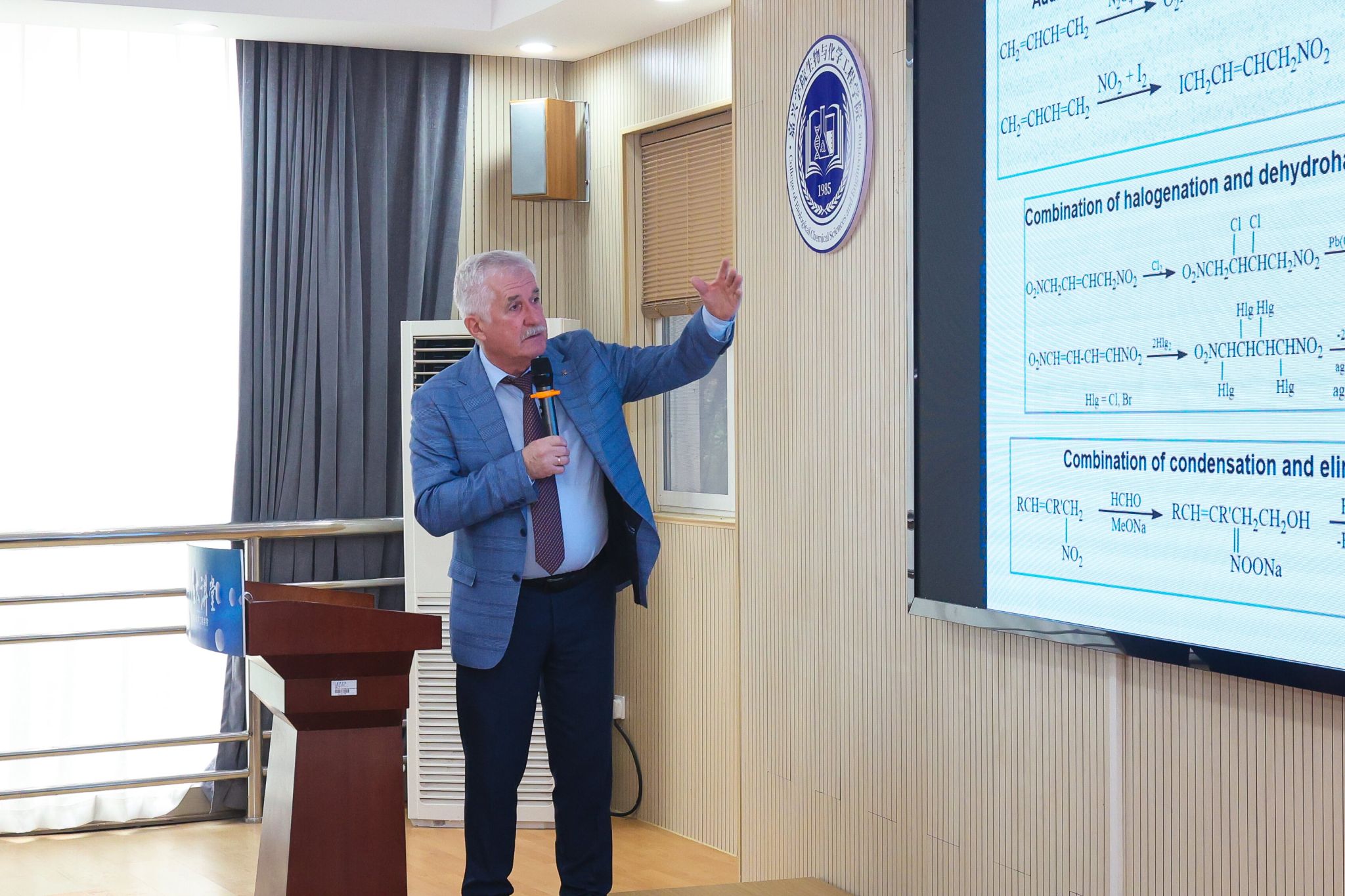 波特金院士在报告中首先介绍了硝基丁二烯(nitrobutadienes)的主要合成方法、反应性以及化学转换,随后重点介绍了其领衔的实验室首次合成卤代硝基丁二烯(halogen substituted nitrodienes)的情况,阐释了卤代硝基丁二烯(nitrohalobutadienes)的特殊反应及其在构建各种杂环体系中的有效性最后波特金院士对卤代硝基丁二烯衍生物(nitro halobutadienes derivatives)在特种材料、光敏薄膜、浮选剂、农药、防腐剂和抗肿瘤剂等方面的实际应用进行了展示。