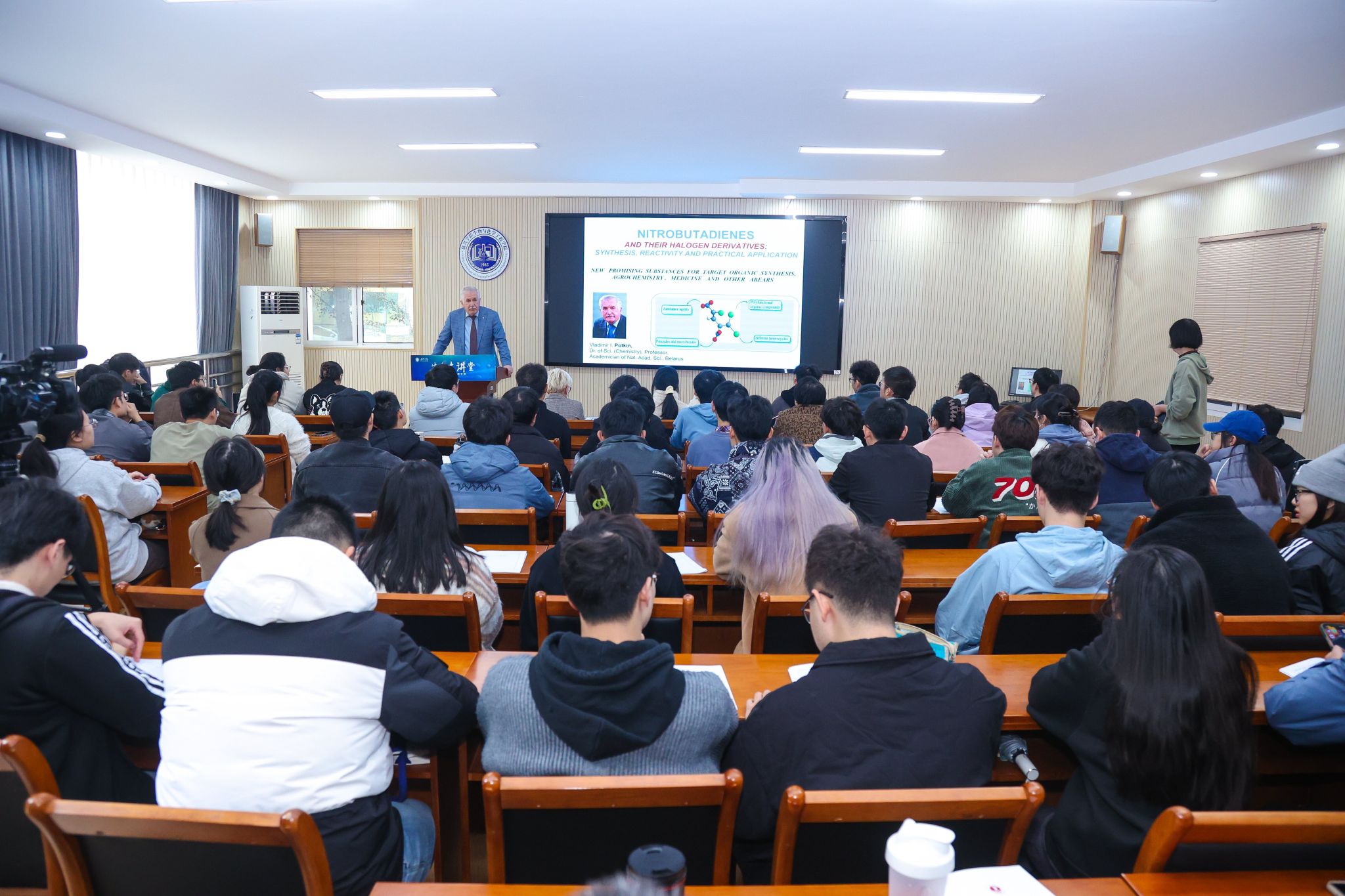 1116日下午,时时彩 举办“生化大讲堂”第二十六期学术交流会,本次大讲堂特邀请白俄罗斯国家科时时彩 院士波特金Vladimir Potkin)作题为“硝基丁二烯及其卤素衍生物:合成、反应性以及实际应用——靶向有机合成、农化、医药等领域的新兴物质”的学术报告。会议由邱观音生教授主持,全院及中澳先进材料与制造研究院师生80余人到场聆听。