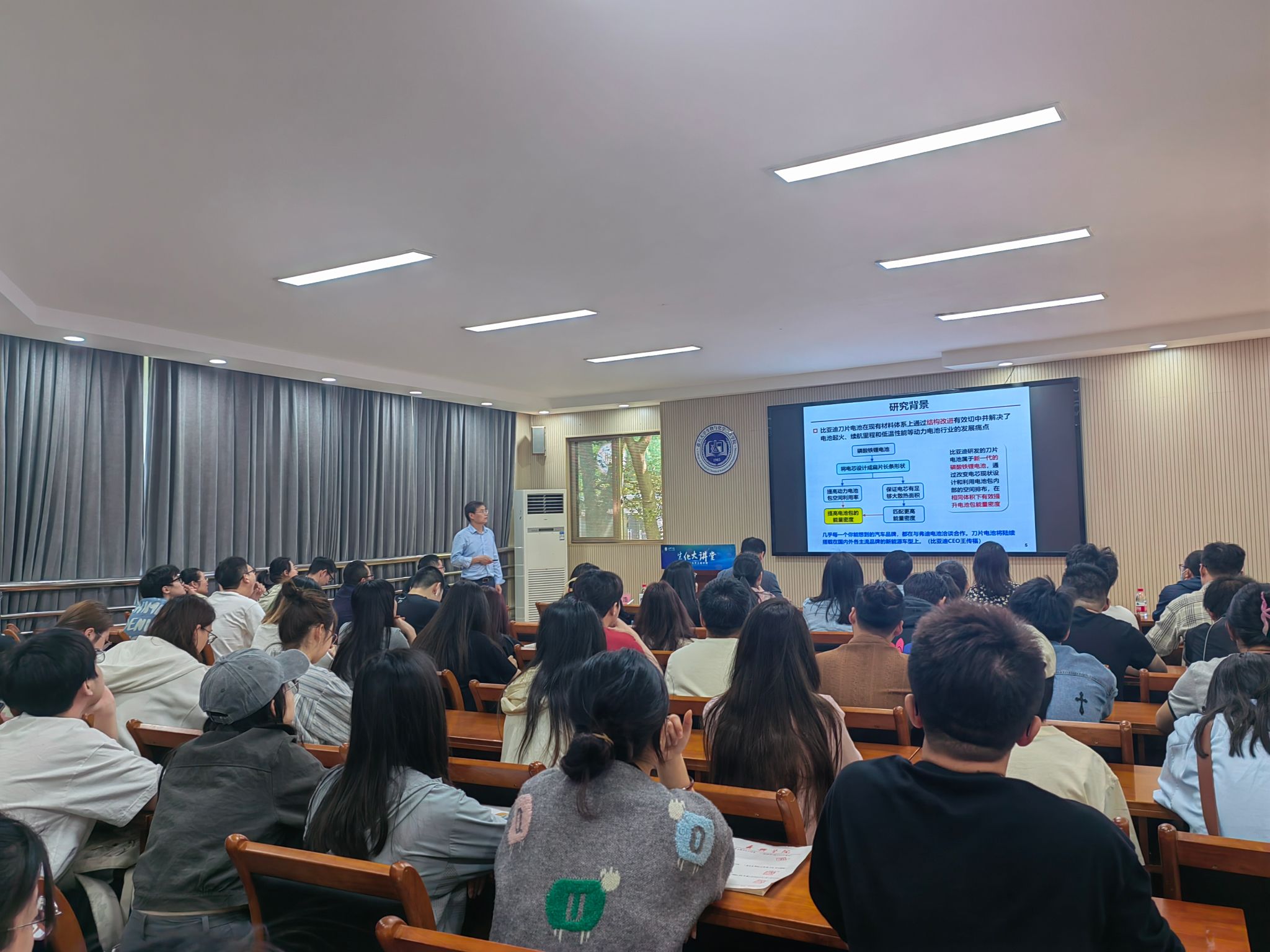 正极材料是锂离子电池的关键材料,特别是高镍层状氧化物正极材料凭借其高能量密度的优势成为当前研究热点。江浩教授在报告中指出,高镍正极材料占据八面体间隙的镍离子与氧阴离子存在电子轨道杂化,在脱锂过程中,镍离子的氧化反应使与其配位的氧阴离子参与电荷补偿,导致氧层间静电排斥力减弱,引起晶胞参数的剧烈收缩和机械应力的引入,从而造成颗粒破碎。与此同时,晶格氧累积电荷损失会造成氧阴离子氧化析出以及电解液氧化分解,加速过渡金属层镍离子向锂层迁移(Li/Ni混排)以及层状相向电化学惰性的岩盐相转变。随后,江浩教授报告围绕如何稳固高镍锰基正极材料在电化学反应过程中的晶体结构、界面化学和机械性能等展开阐述,揭示了高镍锰基正极材料电化学性能的提升机制,并对推动新一代高能量、高安全性能电池的商业化进程进行了展望。在报告结束后的互动交流环节,与会师生踊跃提问,江浩教授耐心地解答了师生们提出的问题,现场气氛热烈。