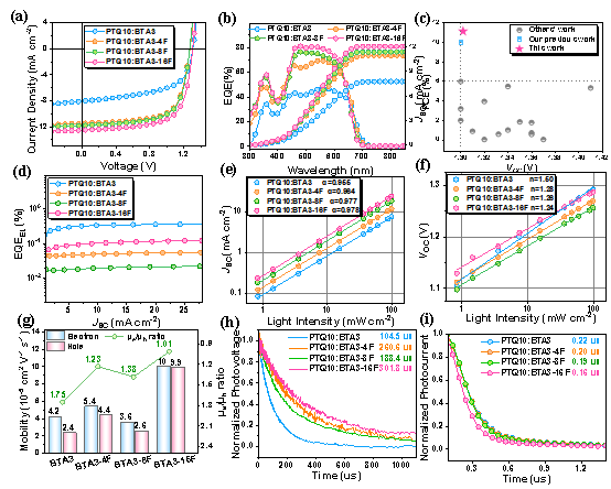 研究结果表明,侧链苯基氟原子取代数量的增加会显著增加分子的四极矩,有利于增强电荷-四极静电相互作用,并进一步促进相邻分子间的紧密堆积和激子离域。此外,F原子取代数量的增加也进一步增强了A/A和D/A分子间的非共价键相互作用。这些共同促进了BHJ各组分之间的基态电荷产生。重要的是,PTQ10:BTA3-16F体系高效的基态电荷产生降低了体系的陷阱态密度,从而进一步促进了光生激子的解离,并延长了光生极化子的寿命,抑制了光生电荷的复合。