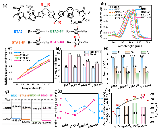 在这项工作中,我们通过引入一种氟取代策略,在微观层面上优化分子四极矩,以实现基态电荷的产生,从而进一步深入探析其对OSC性能的影响。首先,基于我们课题组多年来在苯并三氮唑(BTA)小分子受体的开发基础上(Adv. Energy Mater. 2017, 7, 1602269; Adv. Funct. Mater. 2018, 28,1704507; Nat. Commun. 2019, 10, 2520; Adv. Mater. 2020, 32, 2002122; Nano Energy 2022, 99, 107413; Angew. Chem. Int. Ed. 2023, 62, e202306847; Energy Environ. Sci. 2023, 16, 2199; Angew. Chem. Int. Ed. 2024, 63, e202403051.),我们在经典的小分子BTA3的中心核IDT苯基侧链上进行8F取代和16F取代设计并合成了两种新型非富勒烯受体(NFAs),BTA3-8F和BTA3-16F,然后再将其与BTA3和4F取代的BTA3-4F进行了全面而系统的比较研究。