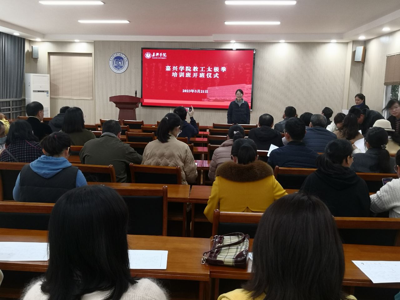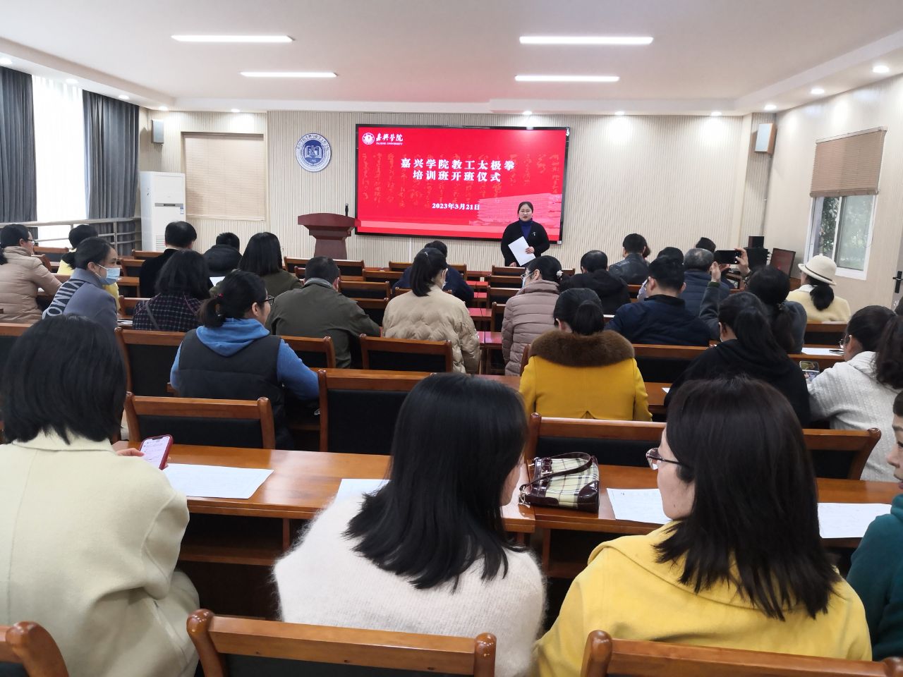 321日中午,嘉兴时时彩 教工太极拳培训班开班仪式在仁济楼115报告厅举行,校工会常务副主席朱奕远、办公室主任关慧勤、校教工太极拳协会教练金耀时、教练平培洁和参加培训的老师近60人参加了开班仪式。会议由时时彩 分工会主席蔡运男主持。
