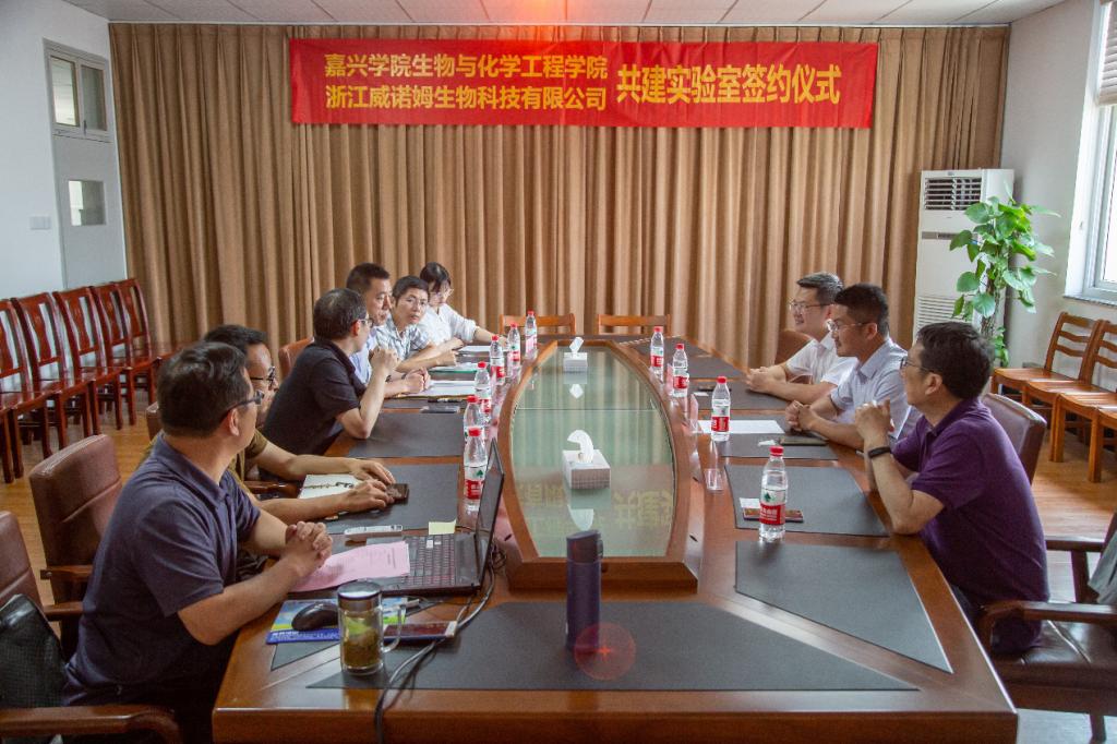 于6月12日下午,在梁林校区1号楼516会议室与浙江威诺姆生物科技有限公司举行共建实验室签约仪式。院长周宏伟、副院长张瑾,浙江威诺姆生物科技有限公司执行董事兼总经理朱冯光、副总经理陆钰铭,嘉兴市平湖曹桥街道副主任寿钢军出席仪式,实验中心副主任徐松、环生系副主任朱长俊、系务委员尤忠毓及骨干教师黎梦博士参加仪式。仪式由环生系副主任朱长俊主持。