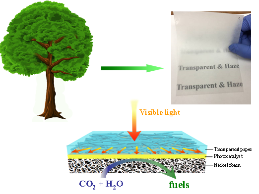 CO2是主要温室气体,利用半导体光催化还原技术在太阳光作用下将CO2催化转化成为CO、CH4CH3OH等高附加值化学品,被认为是控制CO2排放最具前景的绿色技术。然而大部分半导体光催化剂对可见光的吸收和利用率非常低,极大地限制了CO2在太阳光下的光催化转化效率。围绕上述科学难题,研究组基于木材纤维设计和制备了具有高透明、高散射性能的透明纸,将其用于半导体光催化剂活性层表面作为光管理材料,可有效增加光催化剂对可见光的吸收和利用,从而实现光催化CO2转化效率的大幅度提升。此外研究还发现使用这种具有光管理功能的透明纸可以减少CO2光催化体系对入射光线角度的依赖。