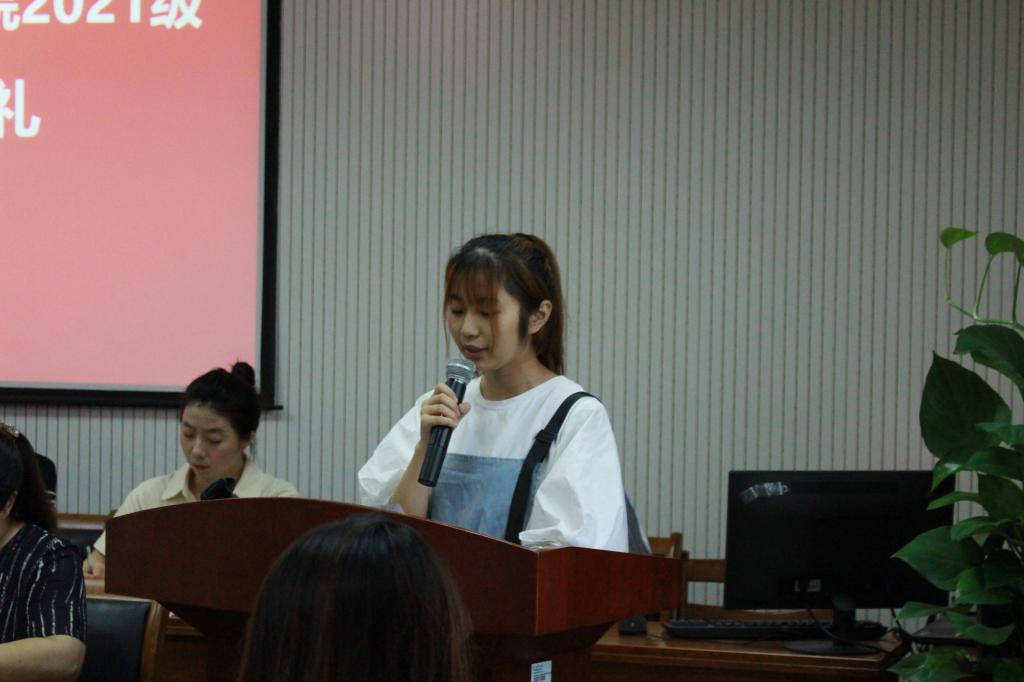 2021级新生应化211班郜文玉同学首先代表全体新生上台发言。她首先总结了过去成长的经验和教训,并表达了对进入时时彩