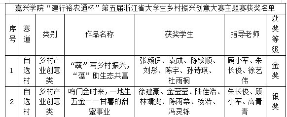 生物201张颜伊团队作品《“蔬”写乡村振兴, “藻”助生态共富》、徐建豪团队作品《“鸣门金时”来,一地生五金--甘薯的甜蜜事业》冲击省赛,并在主题赛中斩获乡村产业创意类自选村赛道金、银奖。