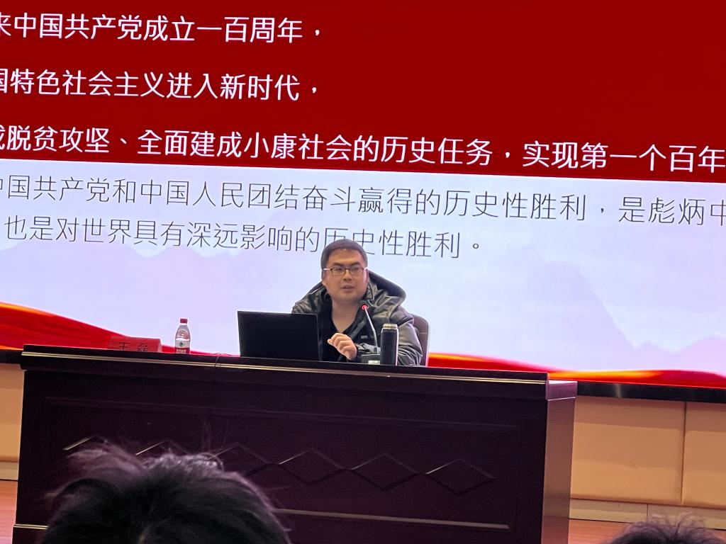 王磊报告主题是《二十大报告核心要点解读》。他紧扣党的二十大主题和报告原文,围绕过去五年的工作和新时代十年的伟大变革、开辟马克思主义中国化时代化新境界、实施科教兴国战略等多方面展开宣讲。他强调指出,全体同学要认真学习宣传贯彻党的二十大精神,树牢对马克思主义的坚定信仰,胸怀“国之大者”,主动融入新时代,练就过硬本领,投身建功立业,贡献智慧力量。