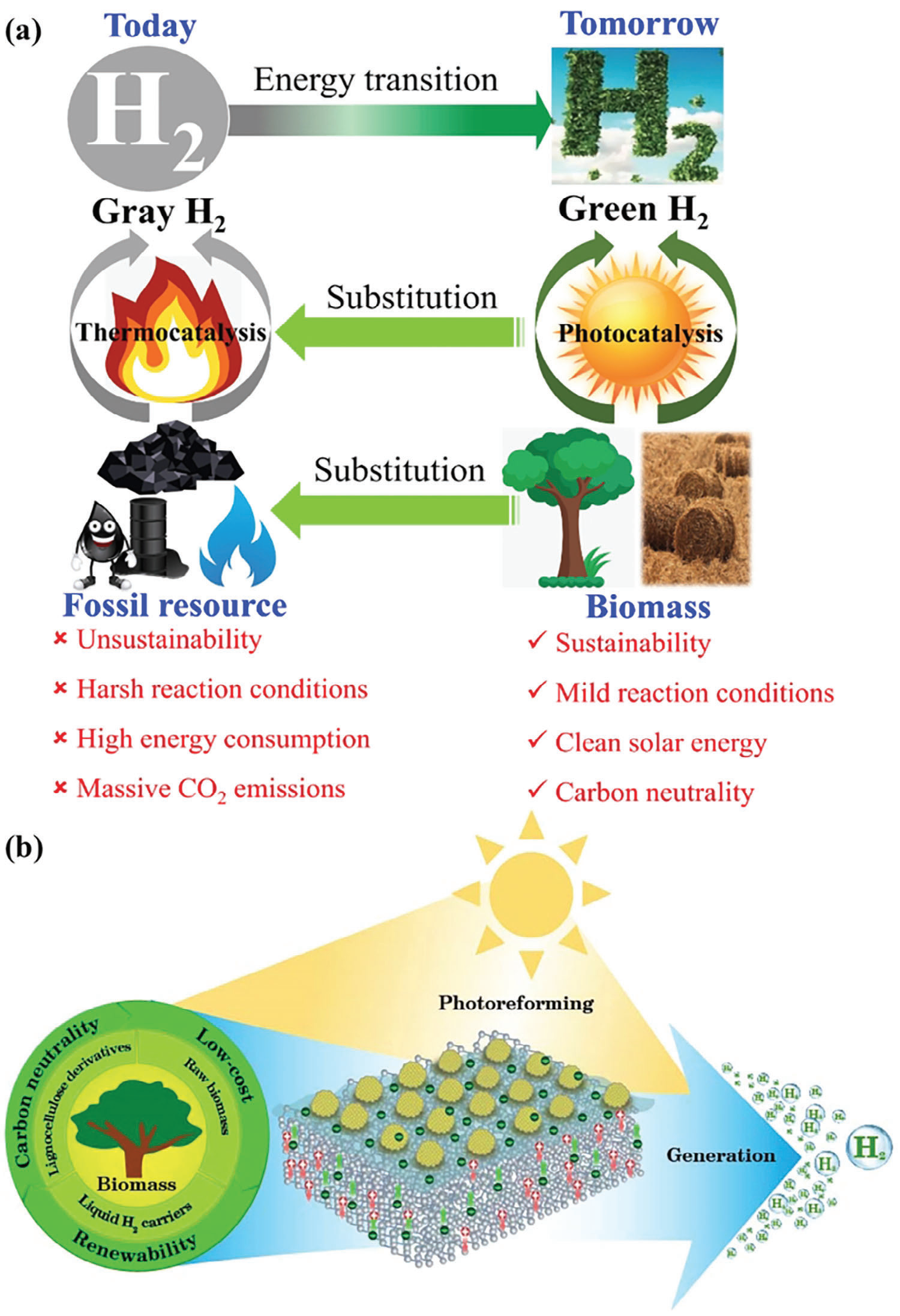 图1(a)化石资源制氢气与太阳能驱动生物质产氢的对比;(b)太阳能驱动光催化剂催化生物质产氢