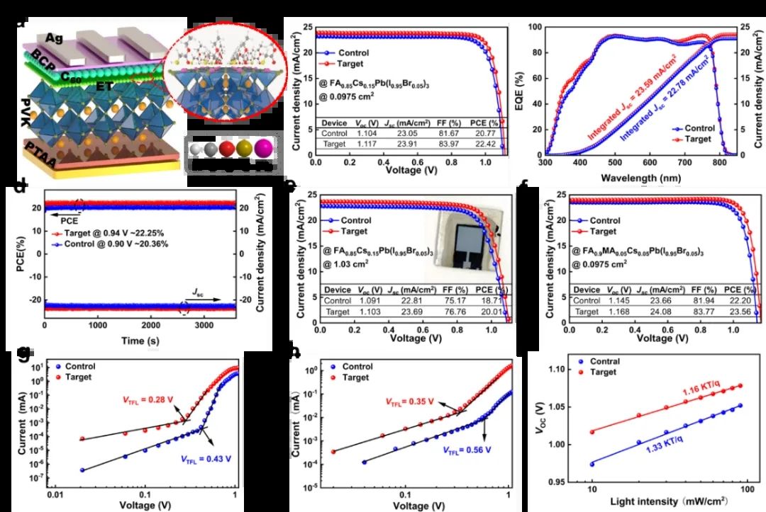该研究通过使用巯基乙酸乙酯(ET)作为PVK薄膜后处理工艺中的功能性分子,成功地实现了对反式结构PSCs的PCE提升;同时,也展示出优异的对I2及PbI2的捕获能力,进而有助于器件稳定性及对环境友好性的改善。经ET表面处理后,PVK薄膜实现了晶粒的二次生长,薄膜晶粒尺寸、结晶度及吸光能力均得到显著增强;同时,ET分子中巯基和羰基官能团均可以和PVK表面的Pb2+结合,实现了对PVK表面缺陷的双齿锚定(即,更有效的缺陷钝化能力);此外,由于能级排列得到改善,PVK/ET/C60功能层界面处表现出更好的电荷转移。最终,基于FA0.85Cs0.15Pb(I0.95Br0.05)3和FA0.9MA0.05Cs0.05Pb(I0.95Br0.05)3活性层制备的小面积反式结构PSCs的PCE分别达到22.42%和23.56%(经认证为23.29%),且有效面积为1.03 cm2的反式PSCs(PVK层为FA0.85Cs0.15Pb(I0.95Br0.05)3)效率突破20%。