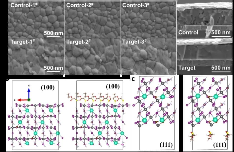 近些年,钙钛矿太阳能电池(PSCs)以其优异的光电转换效率(PCE)和简单的制备工艺受到广泛关注。然而,多晶钙钛矿(PVK)材料在薄膜加工和生长过程中,不可避免地导致PVK本体以及表面和晶界处产生大量缺陷,进而影响器件的PCE及稳定性。因此,制备具有大尺寸晶粒、更低晶界和缺陷密度的高质量PVK薄膜至关重要。目前,在表面后处理的基础上,通过一种钝化分子同时实现PVK的结晶调制和缺陷钝化仍然是一个巨大的挑战。另外,在器件运行过程中PVK容易产生PbI2和I2的分解产物,这会进一步诱导器件功能层的老化及对环境产生威胁,例如:产生的具有腐蚀性的I2会加剧电极损伤。因而通过后处理对界面处的I2和PbI2进行有效管理,与获得低缺陷、高结晶度PVK薄膜一样,对于提高PSCs性能至关重要。
