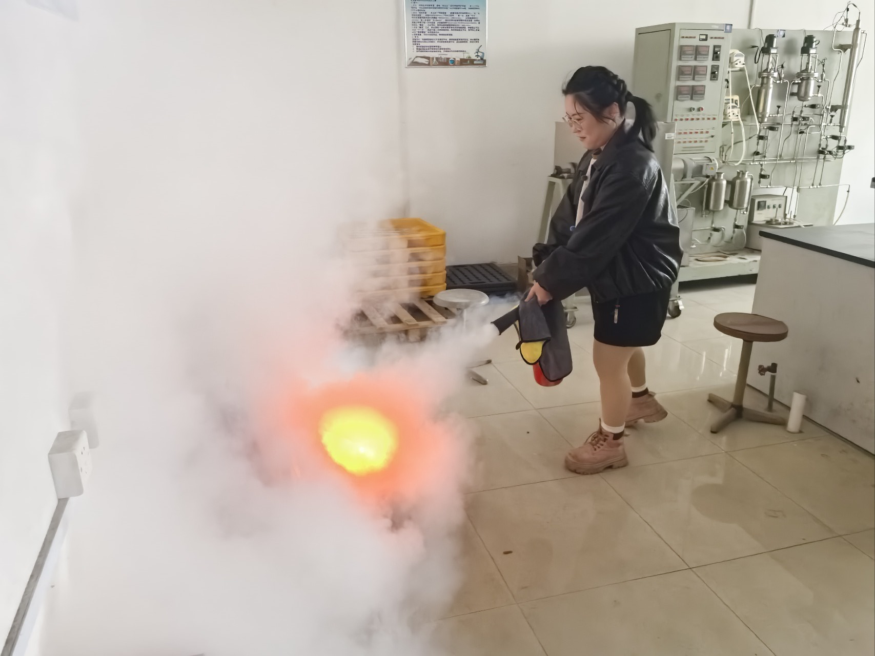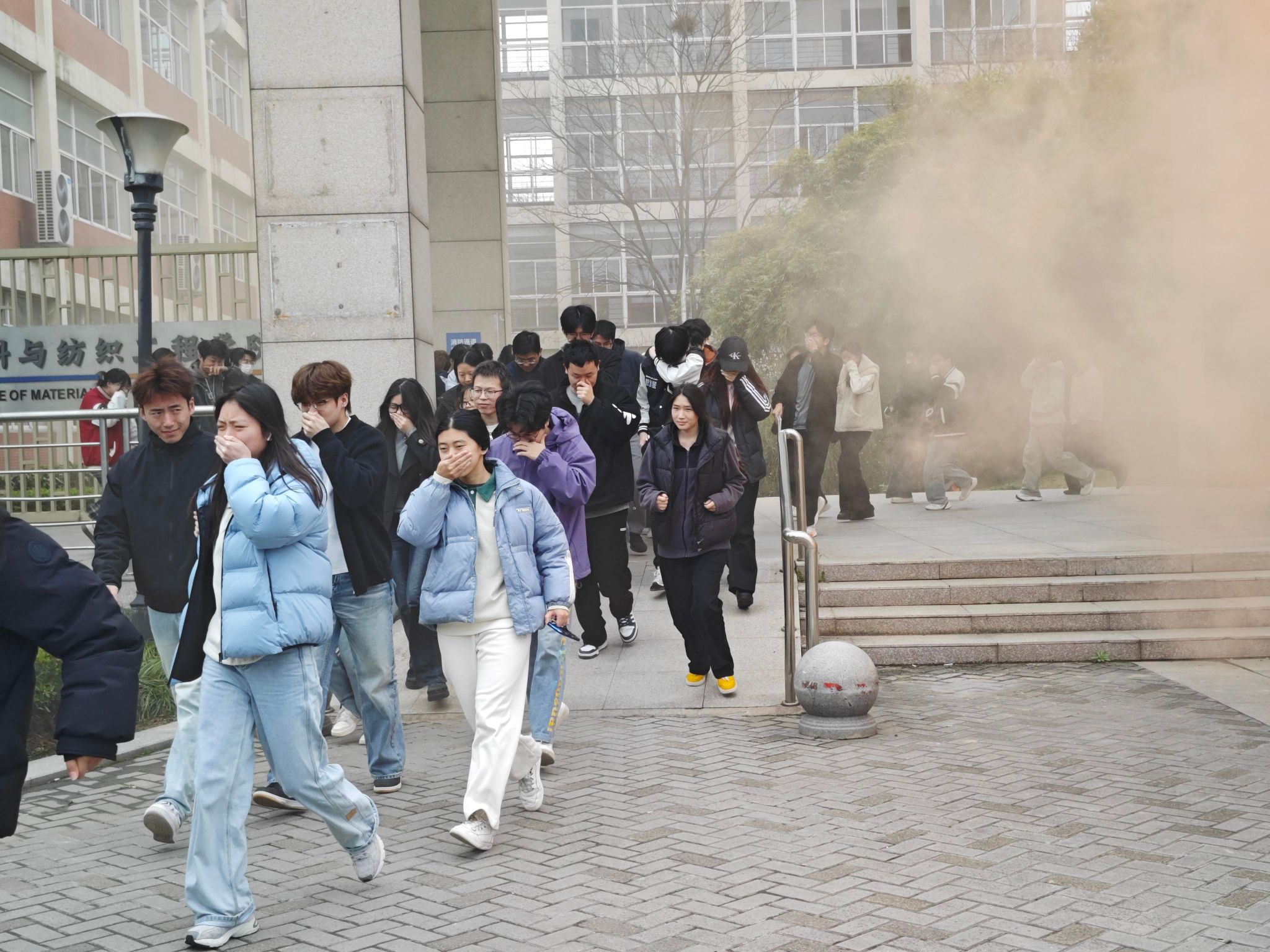 下午13:30,演练正式开始。按照演练流程,模拟火情发生后,工作人员第一时间向安保部报告着火地点,并快速使用灭火器进行灭火处置。随着急促的火灾警报铃声响起,全体师生严格按照演练预案有序疏散。在疏散引导员的引导下,师生们用毛巾捂住口鼻、俯身弯腰前行,沿着消防安全逃生路线快速通过消防通道撤离至安全区域。从警报响起到全体师生集中到达安全地点,用时不到3分钟。随后,工作人员清点人数,确保“不漏一人”。