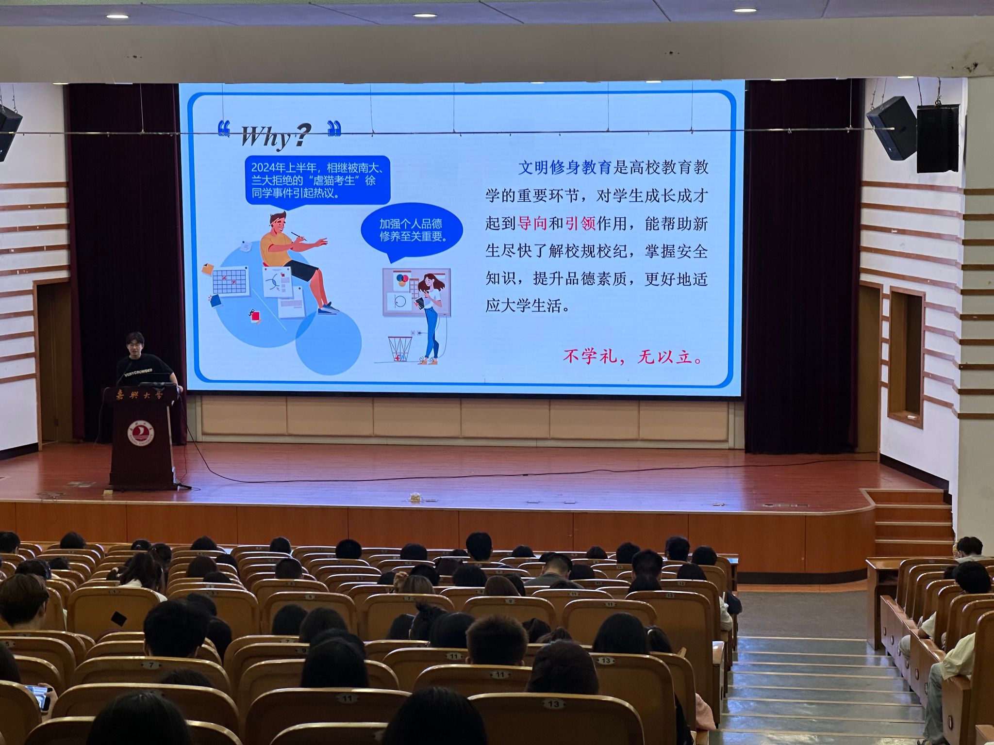 潘佳豪老师以“明德修身,崇学尚行”为主题开展了新生文明修身教育,他从国家安全、交通安全、消防安全、财产安全、人身安全和考试违纪等方面进行了详细讲解,并强调,文明修身教育是高校教育教学的重要环节,对新生成长成才起着导向和引领作用,能帮助新生尽快了解校级校规,掌握安全知识,提升品德素质,更好的适应大学生活。